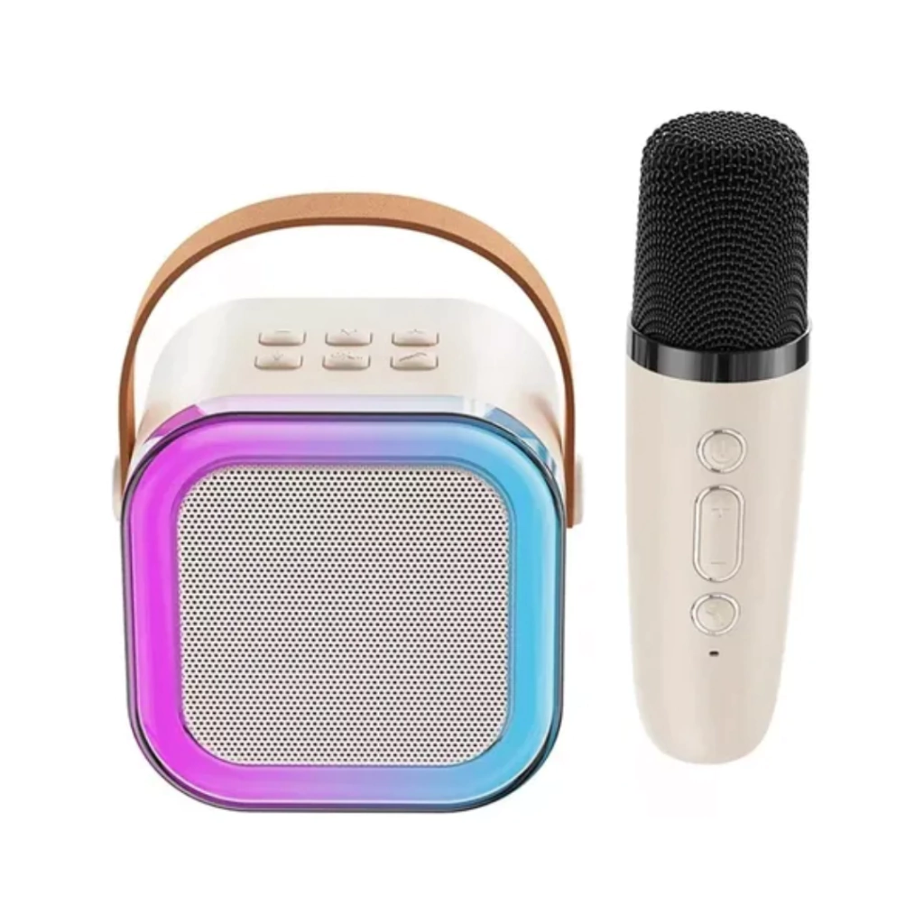Convertí cualquier reunión en una verdadera fiesta con el Parlante Karaoke Portátil K12, la opción ideal para los amantes de la música y los momentos inolvidables. Este parlante, de elegante color beige, combina potencia, versatilidad y diseño moderno para que lleves el entretenimiento a donde vayas.